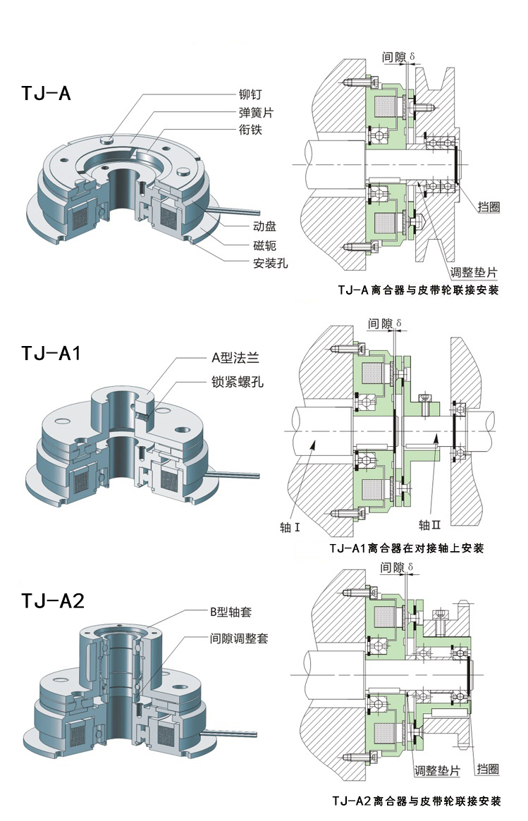 關于安裝尺寸規(guī)格參數(shù)說明,皮帶輪的尺寸規(guī)格暫時沒有,請參考TJ-A型干式單片電磁離合器。