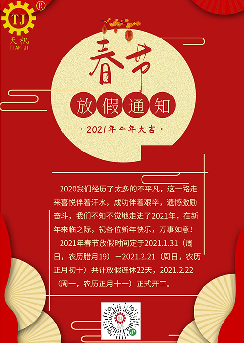 東莞市臺(tái)機(jī)減速機(jī)有限公司天機(jī)傳動(dòng)2021年牛年春節(jié)放假通知如下