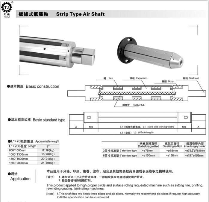 氣脹軸的用途很廣,通常與磁粉離合器、張力控制器配套使用。凡有收卷、放卷、分切的的機器,都可適用氣脹軸,甚至包括輕金屬行業(yè)。如:氣脹軸主要適用于印刷設備有:曬板機、柔印機、凹板機、商標印刷機、涂布機、皮革機、定型 機、壓花機、分條機、模切機、復卷機、紙筒機、制袋機、貼合機、覆膜機、無紡布機、驗布機、燙金機、電池設備等等相關機械配套之使用。