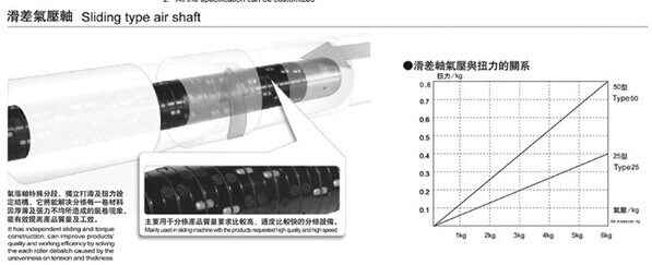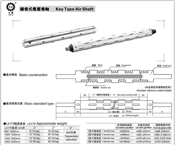 鍵條式氣脹卷軸,鍵式氣壓軸軸生產(chǎn)商(脹氣軸,氣壓軸)適用于扭力及承載重量較高的分條、印刷、復(fù)卷、貼合、制袋、造紙或其他相關(guān)卷取及發(fā)送料的機(jī)械配合使用。本型式有45銅及鋁合金兩種,一般承重低于800kg,長(zhǎng)度小于1500mm軸,建議使用鋁合金管。