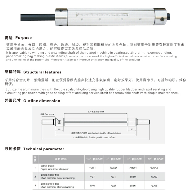 天機(jī)傳動廠家生產(chǎn)的瓦片式氣脹軸又稱板條式氣脹軸,由氣脹軸(氣漲軸)和長條脹瓦兩部分組成。瓦片式氣脹軸采用鋁合金板條,具有經(jīng)濟(jì)效率高、承載量大、紙管放置簡單、充氣時間短、可拆卸軸頭、保養(yǎng)維修簡便等等優(yōu)點(diǎn)。